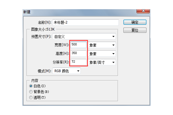 打开Photoshop,点击菜单“文件”->“新建”,建立一个新的空白文档。假设网站中的图片尺寸要求是500 X 350像素,可参考上图设置,然后点击“确定”按钮。本步骤的目的是建立一个符合网站尺寸要求的文档,用于编辑。